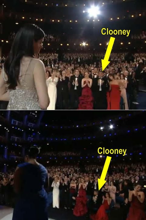 "You saw this last night if you were following my live tweet-blog, but what was up with George Clooney not standing up with the rest of the audience after Mo'nique won her Oscar? OK, maybe he's just not a standing ovation kind of guy. I can buy that. Um, except when Sandra Bullock won, he gave her a standing ovation. To recap: